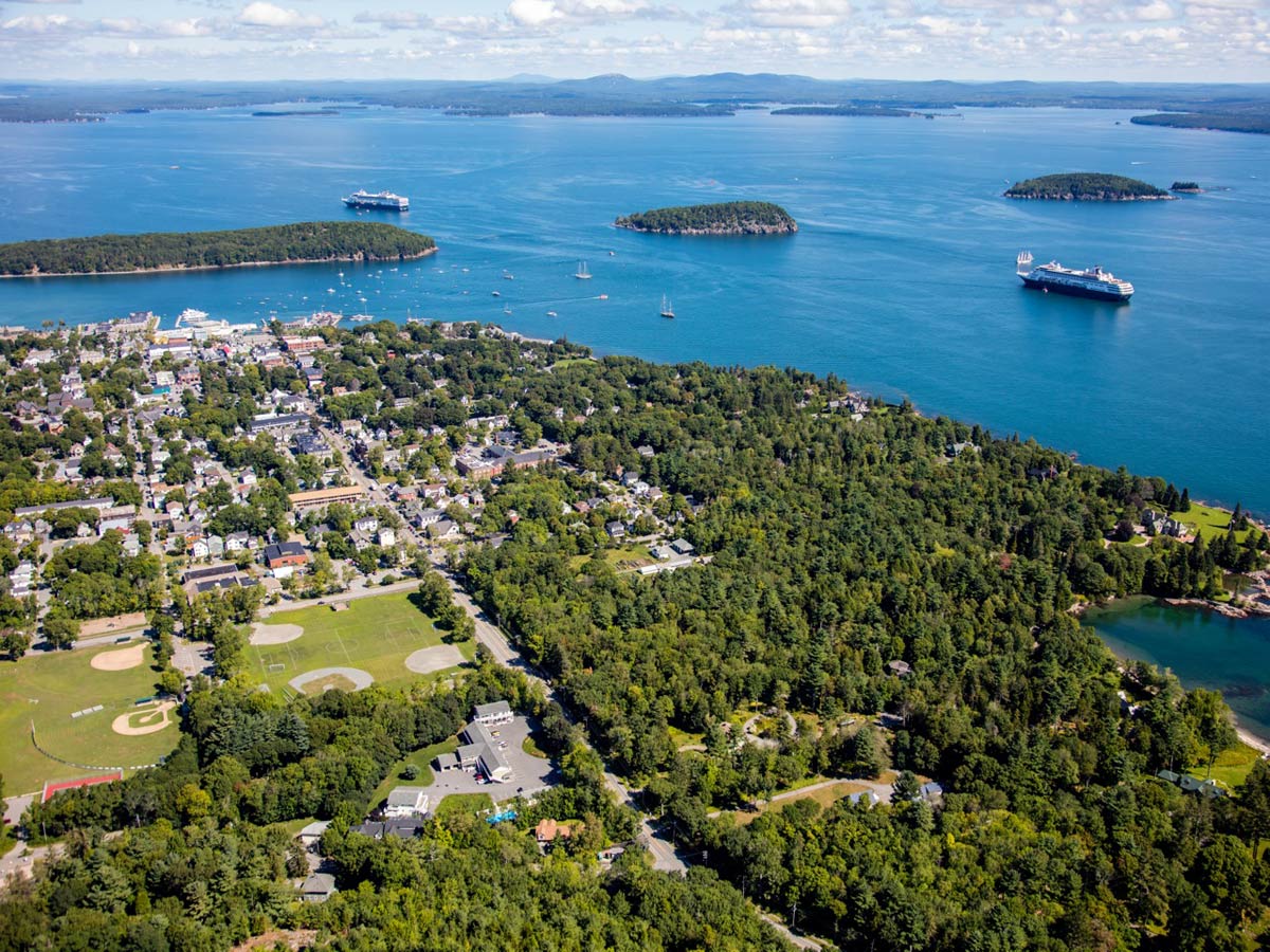 The following picture is an aerial view of Bar Harbor, Maine on Mount Desert Island. This is a northerly view. Cromwell Harbor Motel is at the lower left just below the green Athletic Field. The road that begins near center at the bottom is Main Street which continues northward through the main part of the Bar Harbor Business District. On the horizon is the mainland of Maine. The island just off the shore at the upper left is Bar Island. During low tide a natural land bridge forms that allows people to walk to the island from Bar Harbor. To the right are the Porcupine Islands. A large part of the land on Mount Desert Island, as well as the outlying islands, are part of Acadia National Park.